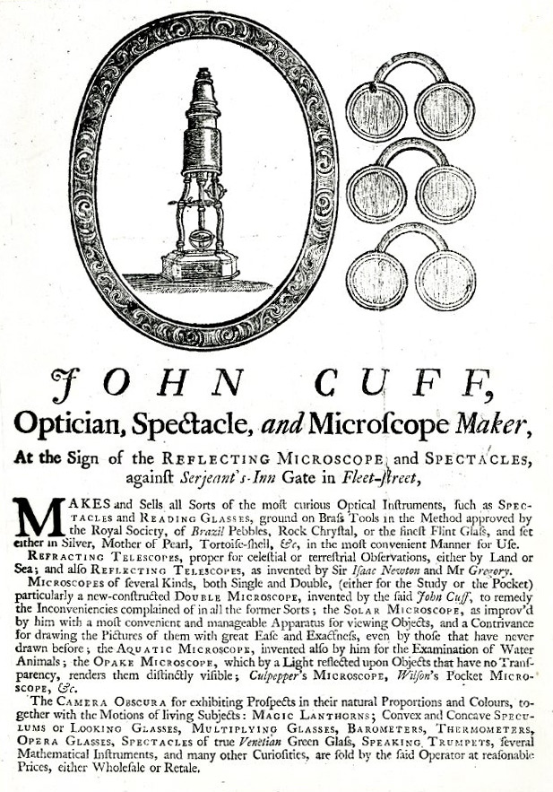 The painting is John Cuff and his assistant (1772) by Johann Zoffany, commissioned by George III. John Cuff (1708-72) was a Fleet Street optician, maker of spectacles and microscopes.